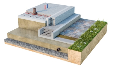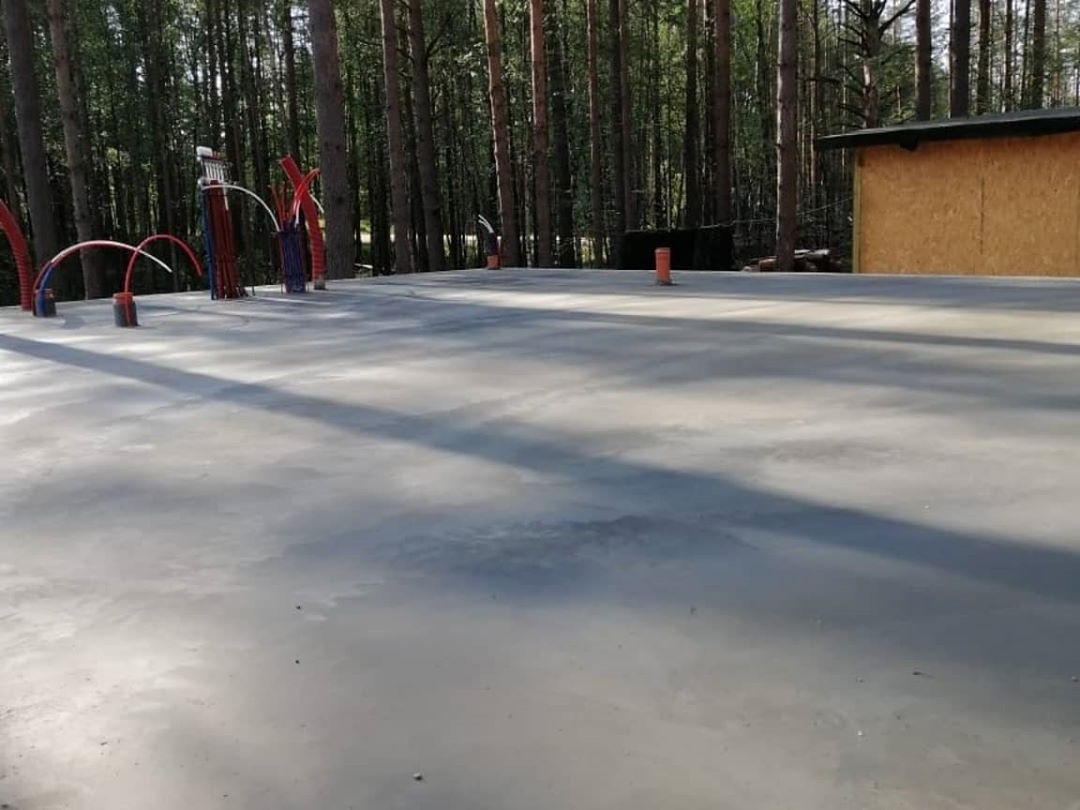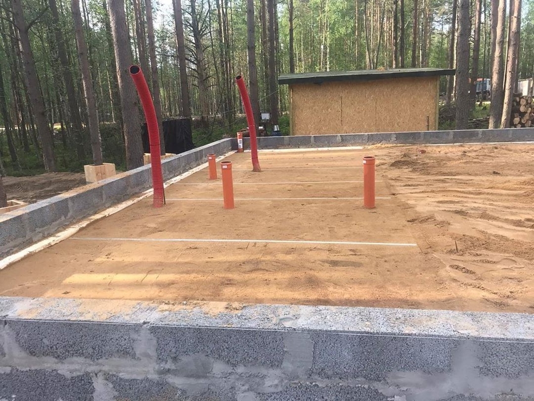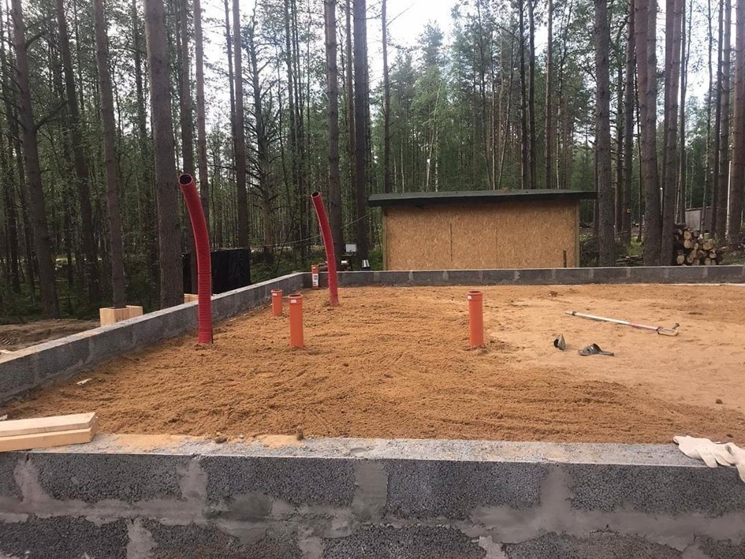 3. На плиты отсыпается послойно песок, щебень, керамзит, пока до края цоколя не останется 15-20 см. По всей поверхности тщательно укладываются трубы коммуникационных каналов, арматурные каркасы, и площадь фундамента полностью заполняется бетоном. Раствор будет застывать и набирать прочность не менее 30 дней.