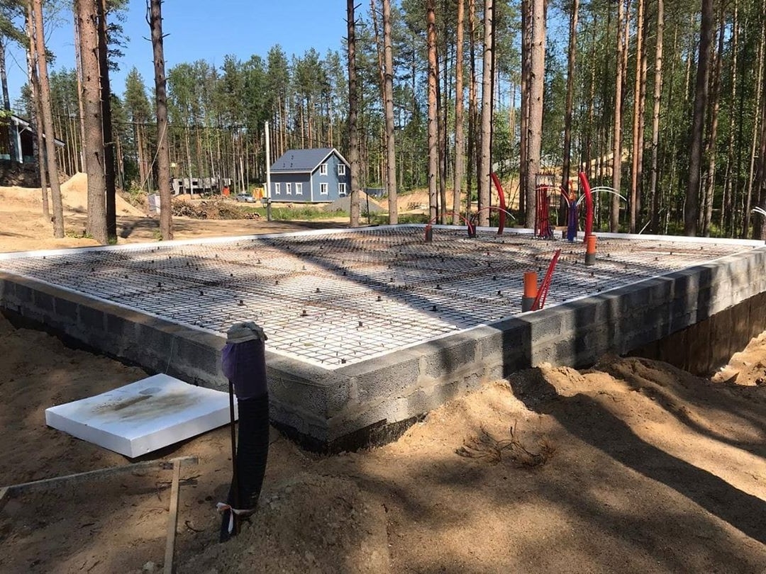1. Первый этап начинается с обустройства плавающего ленточного фундамента, который закладывается над отметкой промерзания грунта. Возводится ленточное основание традиционным способом. Копается траншея, отсыпается и утрамбовывается песчано-гравийная подушка, прокладываются коммуникационные каналы. Устанавливается опалубка, в которую укладывается арматурный каркас и заполняется бетоном. Песчано-гравийный и бетонный слой составляют по 20-25 см.